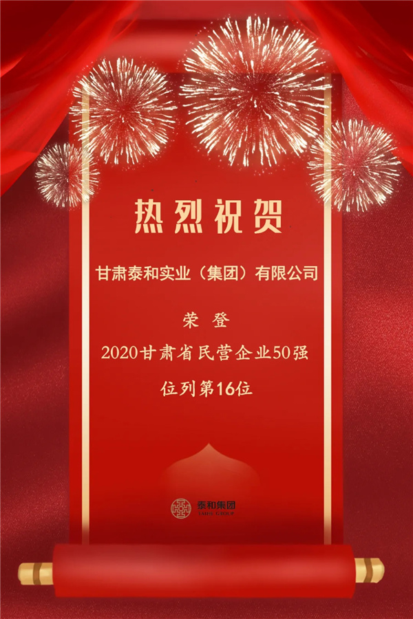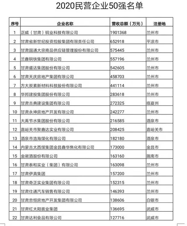 2020年,甘肅省工商聯(lián)對(duì)全省范圍內(nèi)2019年度營(yíng)業(yè)收入1000萬元以上的民營(yíng)企業(yè)進(jìn)行調(diào)研,經(jīng)過收集、整理、核驗(yàn)憑證、數(shù)據(jù)分析,評(píng)選出2020甘肅省民營(yíng)企業(yè)50強(qiáng)。4月13日上午,甘肅省工商業(yè)聯(lián)合會(huì)(民間商會(huì))十二屆五次執(zhí)委會(huì)議上發(fā)布了2020甘肅省民營(yíng)企業(yè)50強(qiáng)名單,我司榮登榜單,位列第16位。