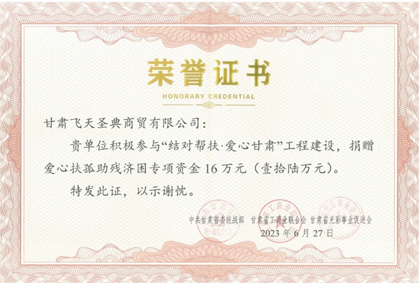 甘肅飛天圣典商貿(mào)有限公司熱衷公益事業(yè),履行社會責(zé)任,傳遞公益正能量,積極開展慈善扶貧、助學(xué)等活動,用實(shí)際行動踐行公益。今后,公司將繼續(xù)在助推鄉(xiāng)村振興、扶危濟(jì)困、助學(xué)助弱等方面發(fā)揮積極作用,為我省公益事業(yè)發(fā)展貢獻(xiàn)力量。